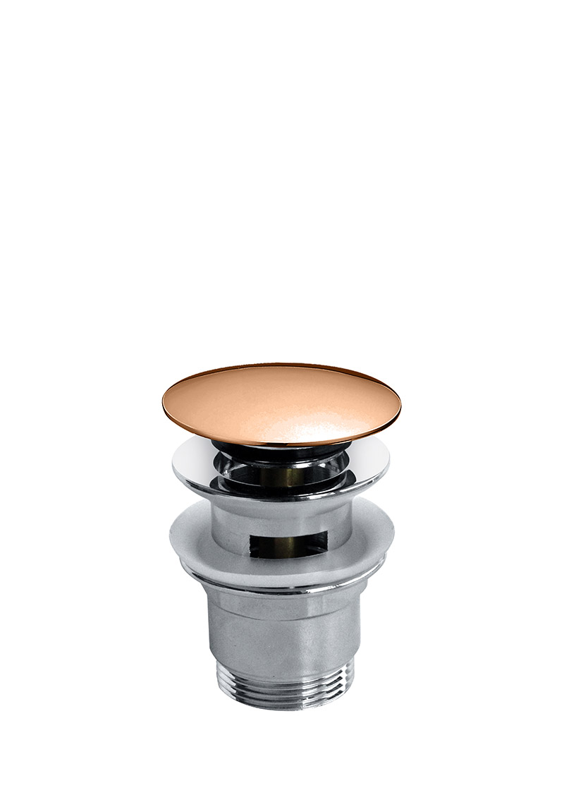 Messinkinen pohjaventtiili jousellisella kannella. Ylivuotoputkella varustettuja pohjaventtiilejä käytetään ylivuotosuojalla varustetuissa pesualtaissa.