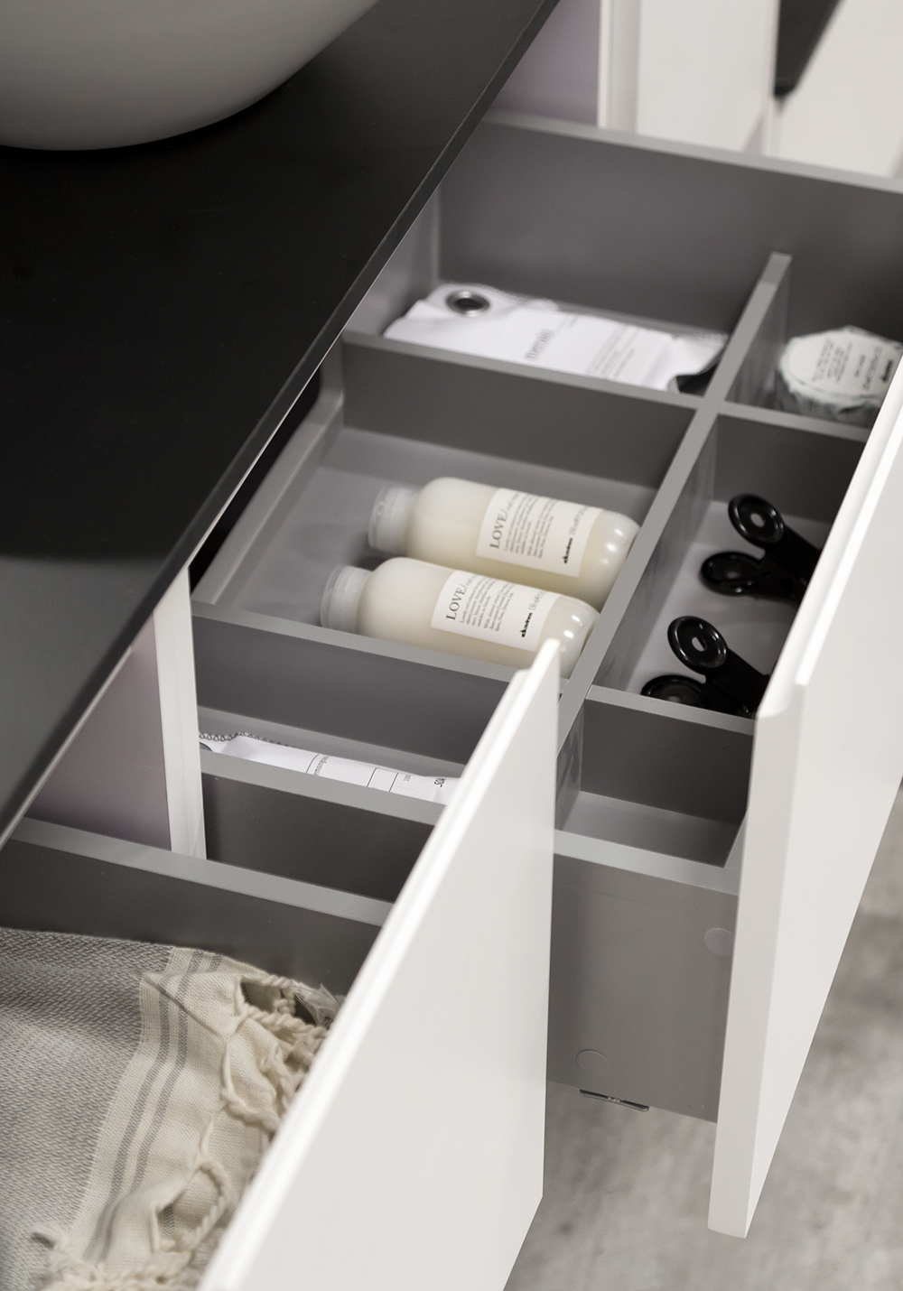 Lifestyle Concept on erittäin joustava kalustesarja, joka tarjoaa monipuolisen tavan sisustaa kylpyhuone vain tilan ja mielikuvituksen ollessa rajana. Vain tila ja mielikuvitus asettavat rajoitukset. Lifestyle Concept tarjoaa vaihteluvuutta ja on muokattavissa juuri sinun olosuhteisiisi. Lupaamme, että täältä löytyy jokaiselle jotakin. Valitset itse korkeuden ja leveyden eri laatikostovaihtoehdoilla. Voit valita kolmen eri pesualtaan välillä – matala posliininen, korkea posliininen tai irtonainen allas, joka asetetaan vedenkestävälle painelaminoidulle tasolle. Moduulit toimitetaan valmiiksi koottuina.