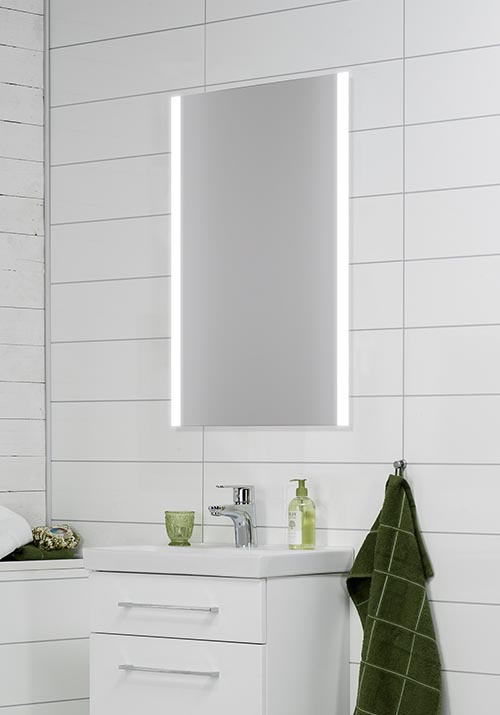 Tyylikäs peili, jossa LED-valaistus sivuilla. Valaisee ulospäin ja suoraan eteenpäin ja mahdollistaa hyvän valaistuksen esimerkiksi meikkaamisen ja parranajon aikana. Lämpimän valkoinen valo, 3000K. IP44.
