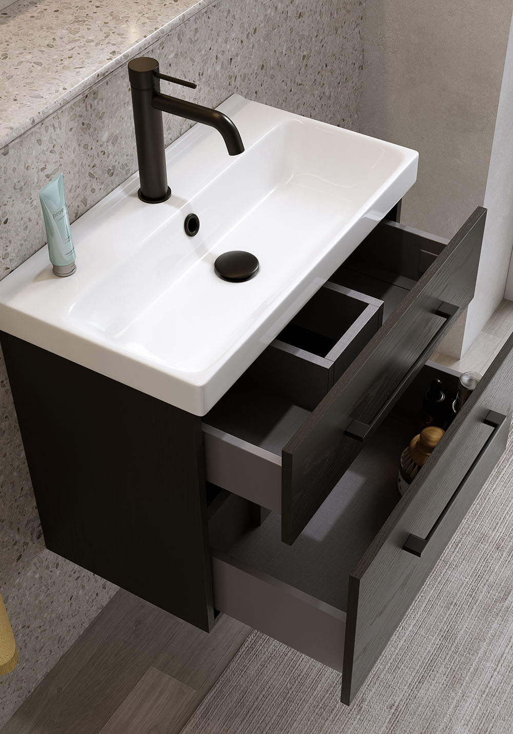Fix Trend -kaluste, leveys 55 cm, on helppo yhdistää Noro-peilien tai peilikaappien kanssa. Kaapissa on Soft Close -toiminnolla varustetut laatikot. Kaluste toimitetaan koottuna ja mukaan tulee vetimet. Osta pohjaventtiili ja vesilukko 321010. Lisäsäilytystilaa varten suosittelemme Multi-korkeakaappia vastaavassa värissä.