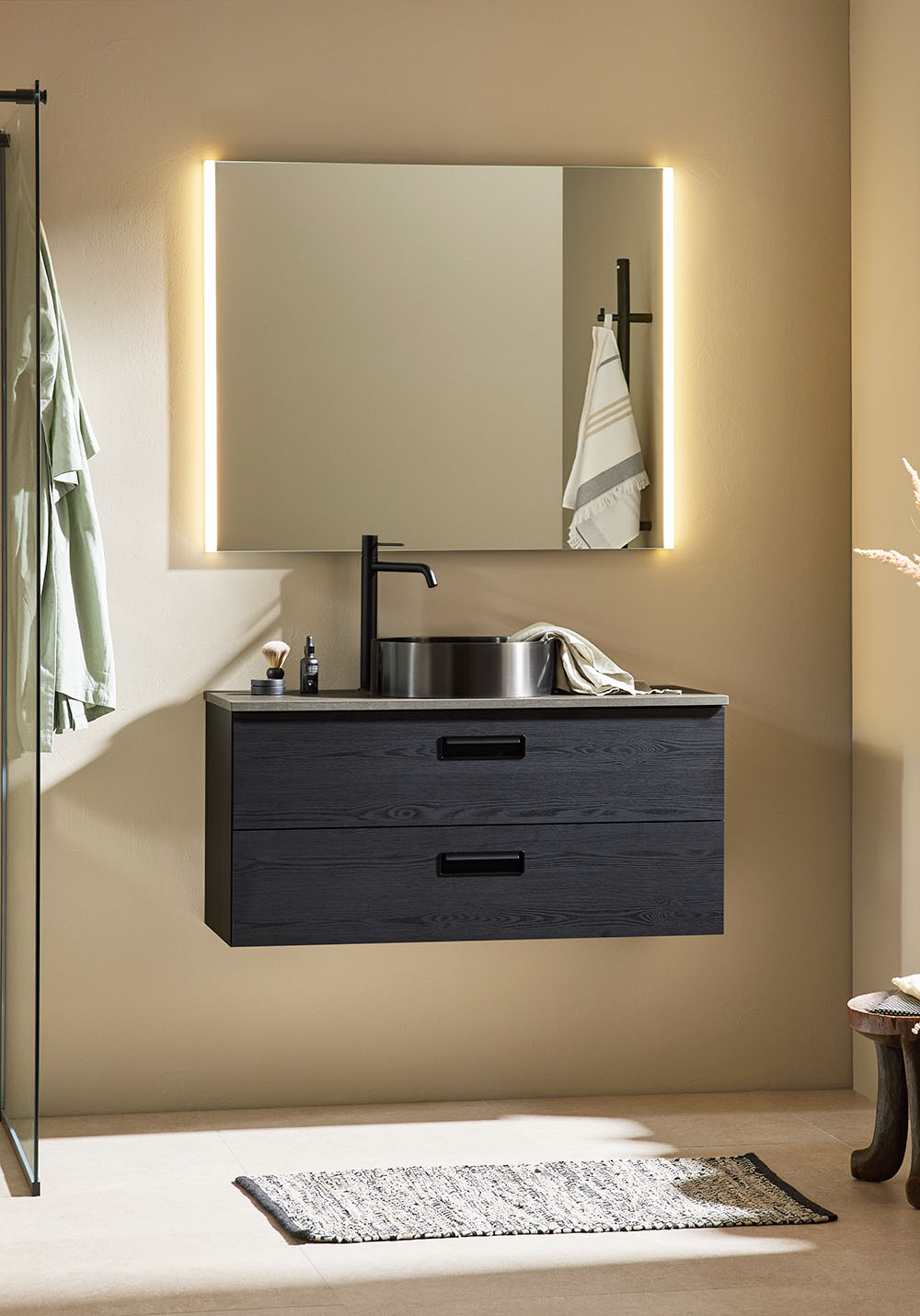 Noro Relounge allaskaappi modernilla muotoilulla. Ainutlaatuiset mitat ja integroidut vetimet auttavat luomaan helposti henkilökohtaisen ilmeen kylpyhuoneeseesi. Relounge kaluste antaa ylellisen tunnelman kaiken kokoisiin kylpyhuoneisiin. Saatavana matta valkoisena tai mustalla puukuvioinilla, monella eri leveydellä. Kalutetta on saatavana matta valkoisena tai mustalla puukuvioinilla, monella eri leveydellä. Pöytävely on valmistettu MDF levystä jossa kestävä melamiini pinnoite. Valitse lisäksi tyylikäs malja-allas. Toimitetaan koottuna, ja soveltuu viemäriliitäntään seinään tai lattiaan. Helppo asentaa säädettävät asennuskiskon ansiosta. Osta lisäksi pesuallas tai pöytälevy malja-altaalla, pohjaventtiili, viemärisarja, pistorasia ja hana.