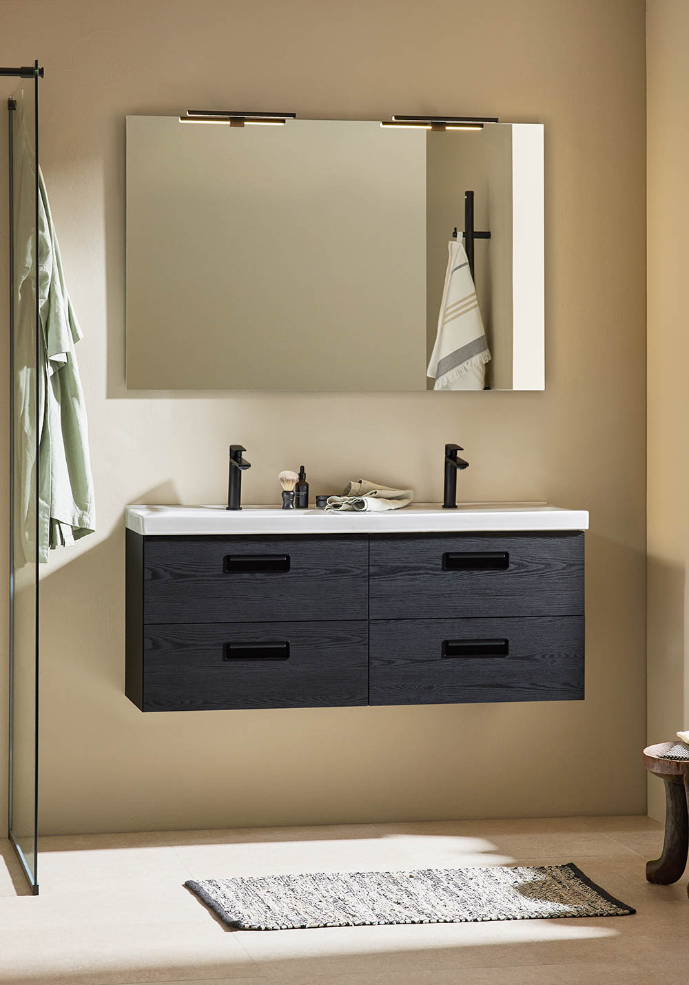 Noro Relounge kylpykaluste, posliini altaalla on tyylikkäästi muotoiltu. Ainutlaatuiset mitat ja integroidut vetimet auttavat luomaan helposti henkilökohtaisen ilmeen kylpyhuoneeseesi. Relounge kaluste antaa ylellisen tunnelman kaiken kokoisiin kylpyhuoneisiin. Saatavana matta valkoisena tai mustalla puukuvioinilla, monella eri leveydellä. Upotettu posliini allas on runsaan kokoinen, ylivuotosuojalla. Toimitetaan koottuna, ja soveltuu viemäriliitäntään seinään tai lattiaan. Helppo asentaa säädettävät asennuskiskon ansiosta. Osta lisäksi pesuallas tai pöytälevy malja-altaalla, pohjaventtiili, viemärisarja, pistorasia ja hana.