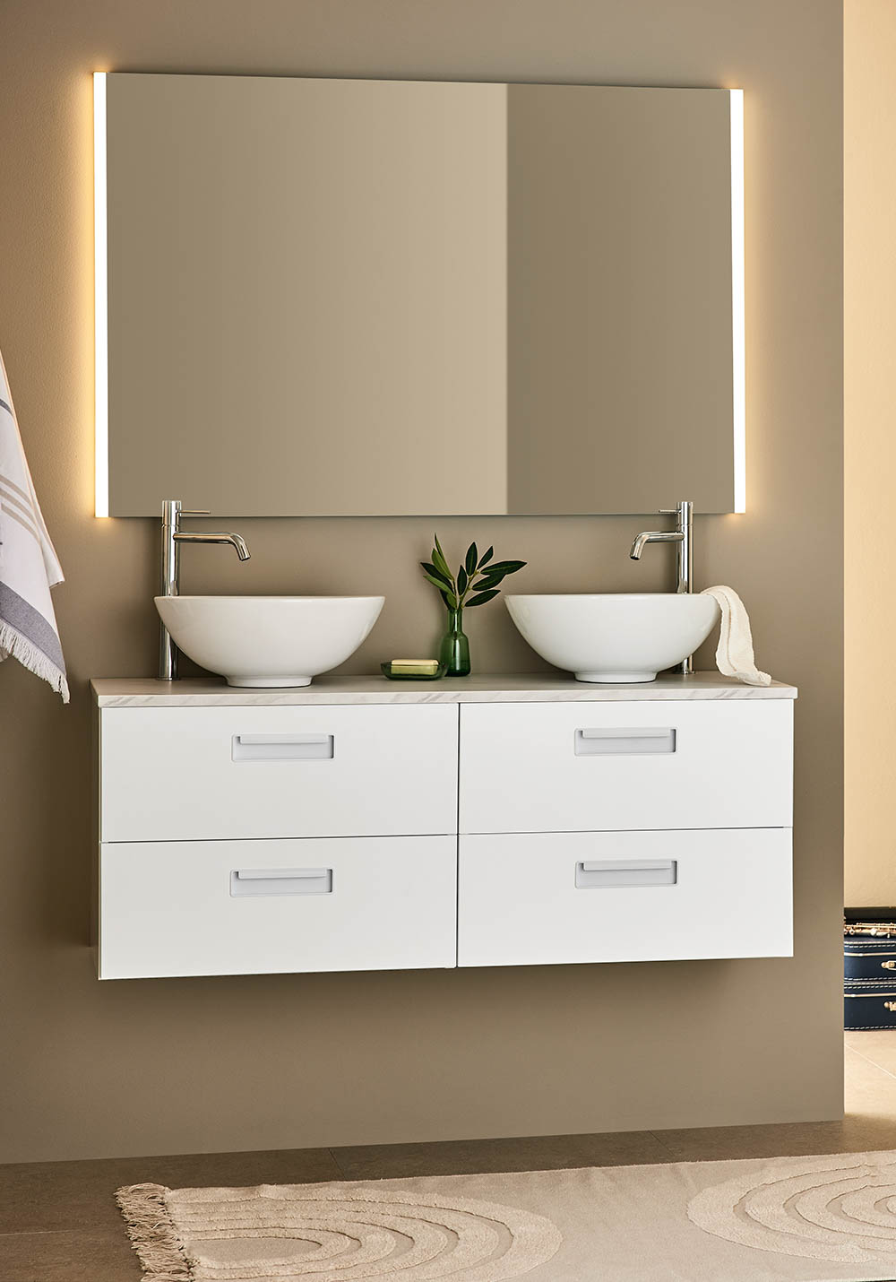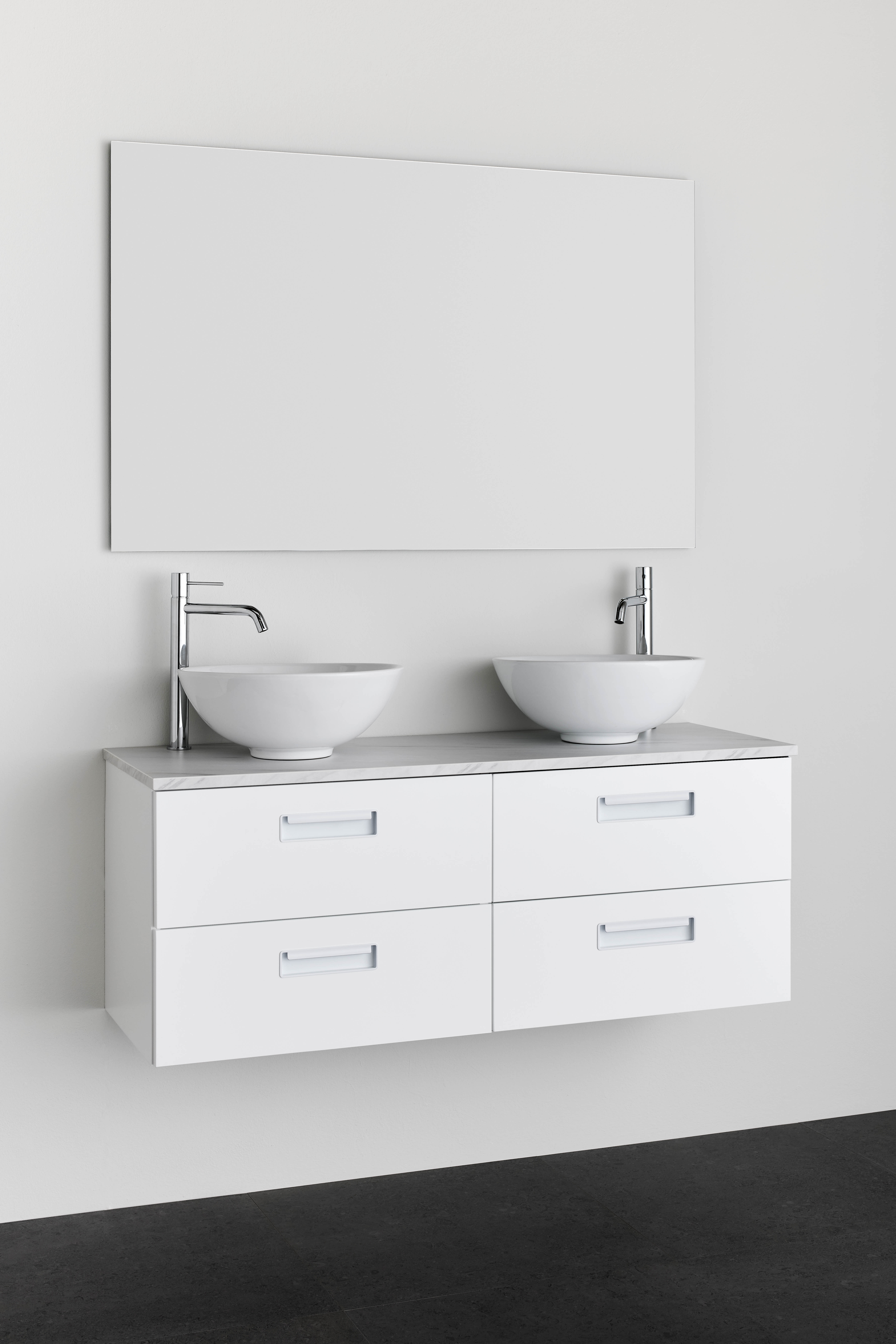 Noro Relounge allaskaappi modernilla muotoilulla. Ainutlaatuiset mitat ja integroidut vetimet auttavat luomaan helposti henkilökohtaisen ilmeen kylpyhuoneeseesi. Relounge kaluste antaa ylellisen tunnelman kaiken kokoisiin kylpyhuoneisiin. Saatavana matta valkoisena tai mustalla puukuvioinilla, monella eri leveydellä. Kalutetta on saatavana matta valkoisena tai mustalla puukuvioinilla, monella eri leveydellä. Pöytävely on valmistettu MDF levystä jossa kestävä melamiini pinnoite. Valitse lisäksi tyylikäs malja-allas. Toimitetaan koottuna, ja soveltuu viemäriliitäntään seinään tai lattiaan. Helppo asentaa säädettävät asennuskiskon ansiosta. Osta lisäksi pesuallas tai pöytälevy malja-altaalla, pohjaventtiili, viemärisarja, pistorasia ja hana.