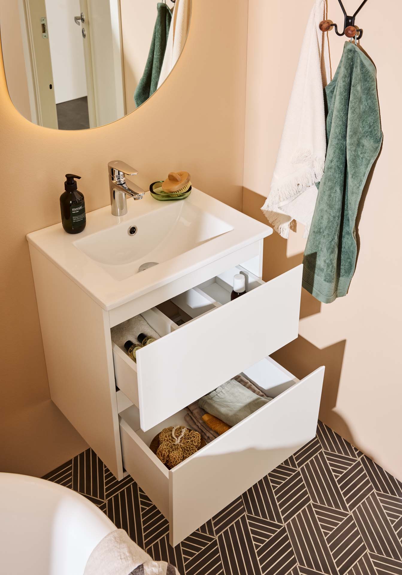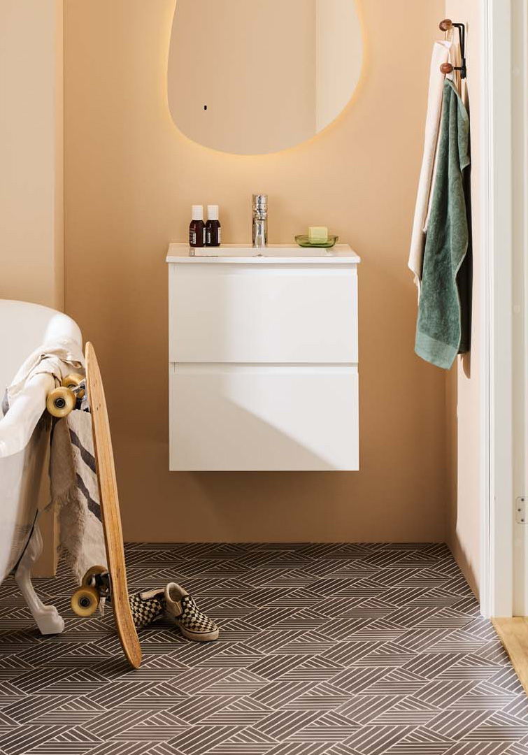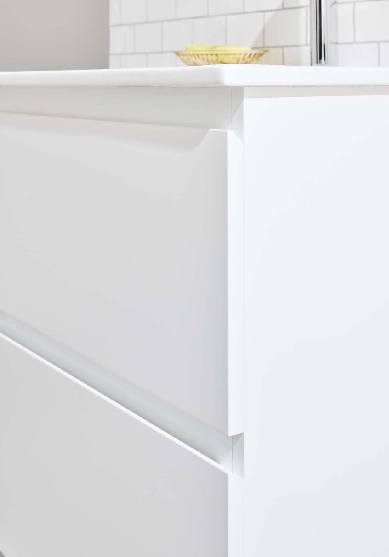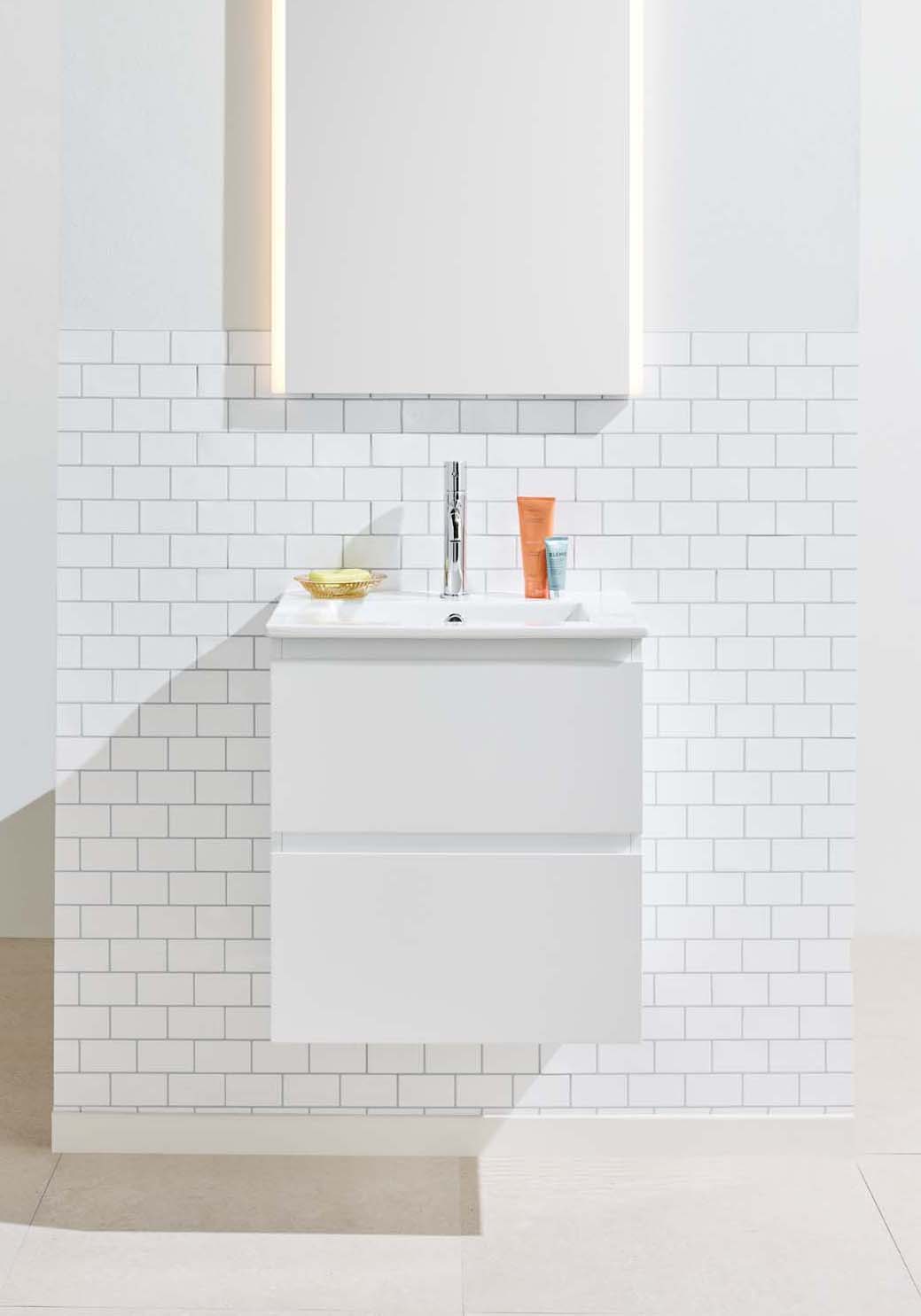 Moderni Noro Vega -allaskaappi on hieman pienemmän kokoinen kaluste ja mukana tulee posliininen pesuallas. Kaksi pehmeästi sulkeutuvaa laatikkoa tarjoavat runsaasti säilytystilaa pieneen kylpyhuoneeseen, ja laatikoissa on integroidut vetimet. Allaskaapin pinta on viimeistelty kestävällä lakkauksella ja kaluste on valmisteltu sekä lattia- että seinäviemäröinnille. Osta mukaan hana, pohjaventtiili sekä vesilukko.