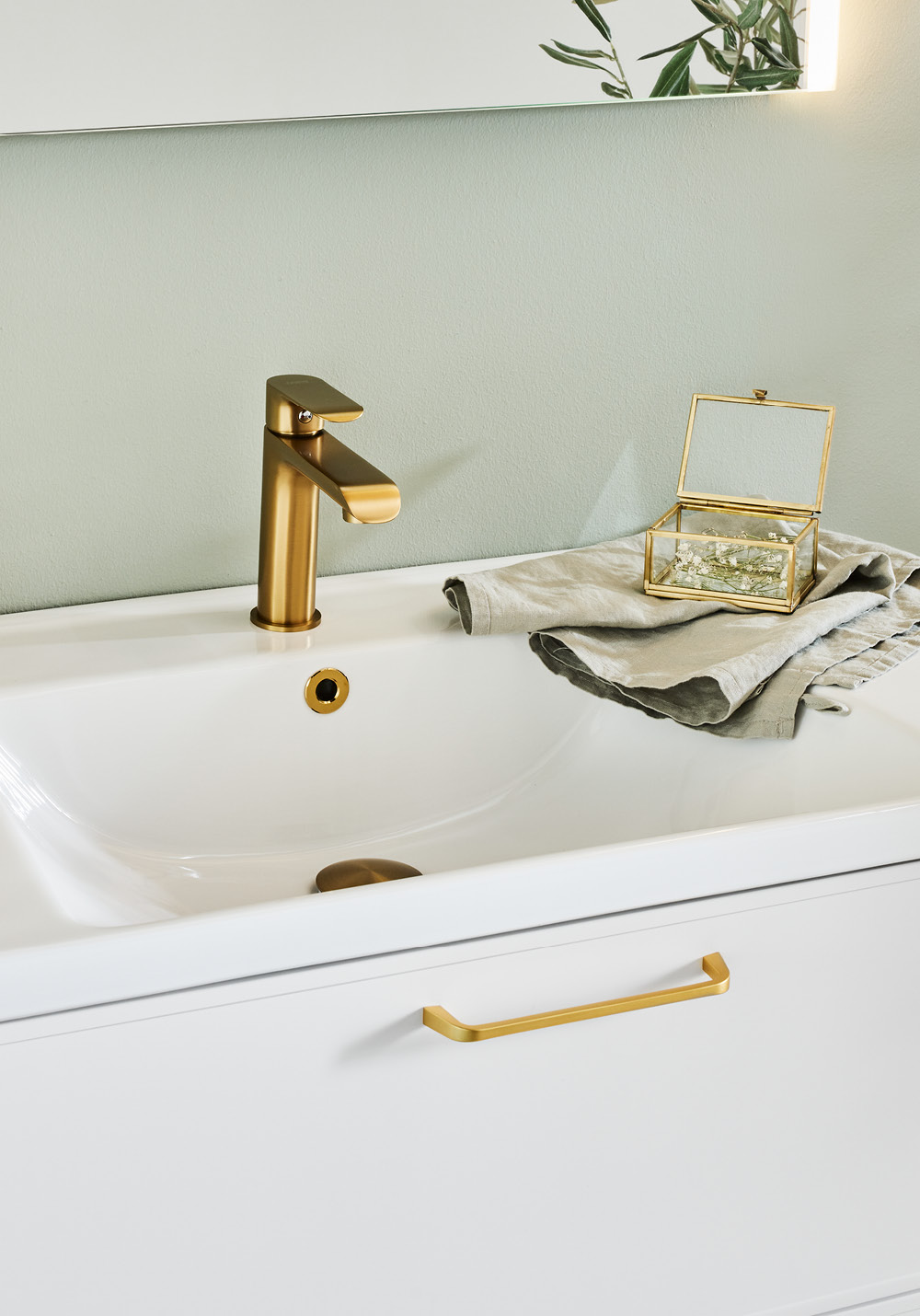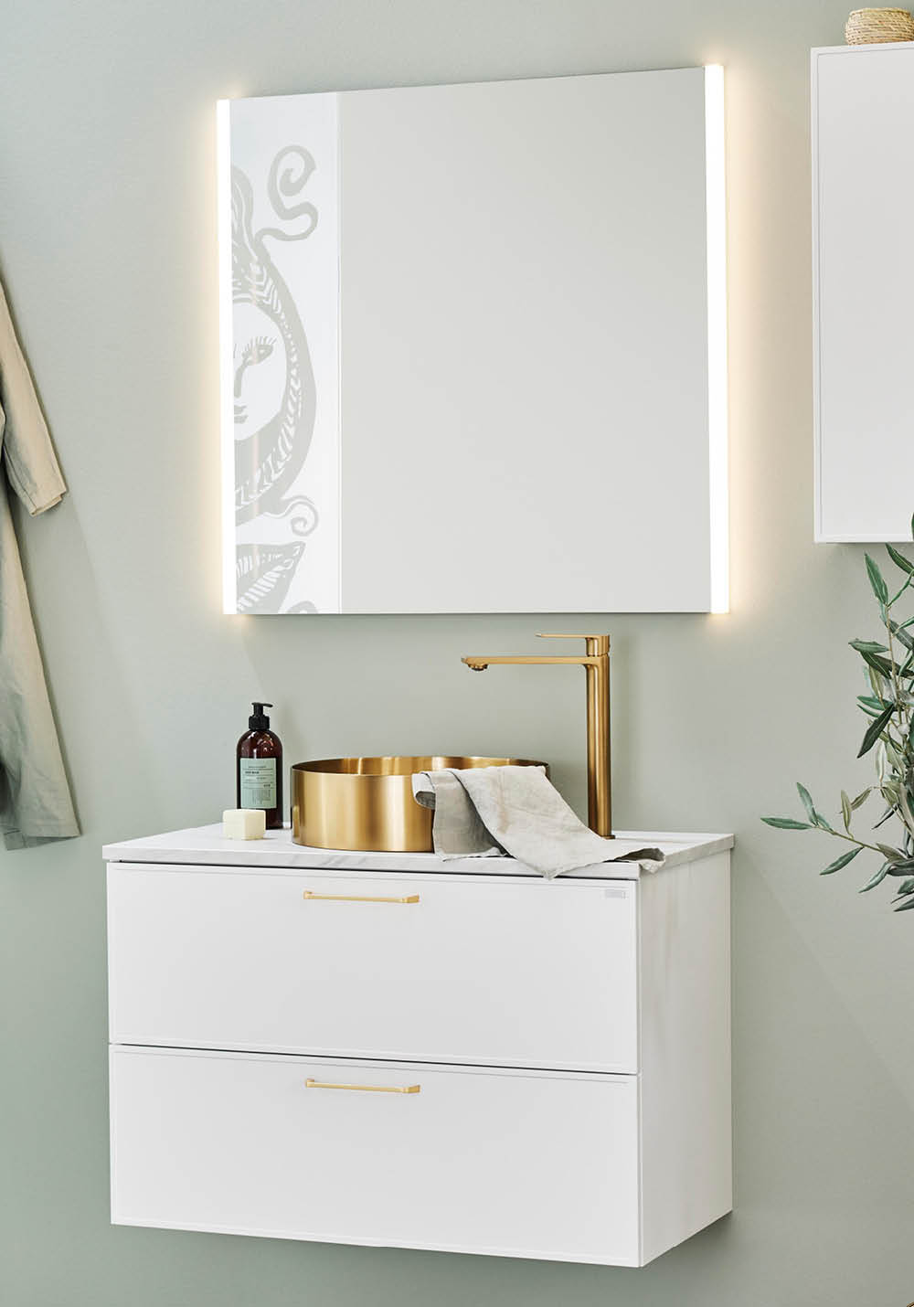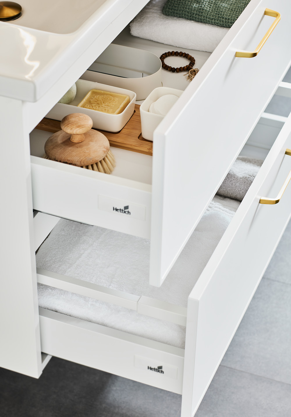 Tulevaisuuden teknologiset vaatimukset saavutetaan klassisella muotoilulla, jossa on ripaus Art décoa. Olemme kiinnittäneet erityisen paljon huomiota yksityiskohtiin ja suunnitelleet kalusteen, jossa laatikoiden etuosan ohut ja tyylikäs kehys antaa tyyliä kylpyhuoneellesi. Vogue on saatavilla useissa leveyksissä ja värivaihtoina ovat matta valkoinen ja antrasiitinharmaa raami etulevyillä. Valitse erillaisista upotetusta posliinialtaista tai MDF-pöytälevy ja sen päälle tyylikäs malja-allas laajasta valikoimastamme. Pehmeästi sulkeutuvat ja kokonaan aukeavat laatikot. Vogue säädettävät ripustushelat helpottavat asennusta ja säätämistä. Sisältää lokerikon ja irrotettavan pohjamaton. Toimitetaan valmiiksi koottuna. Osta vedin. Vetimen poramerkinnät: CC 64, 128, 160, 256, 320.
