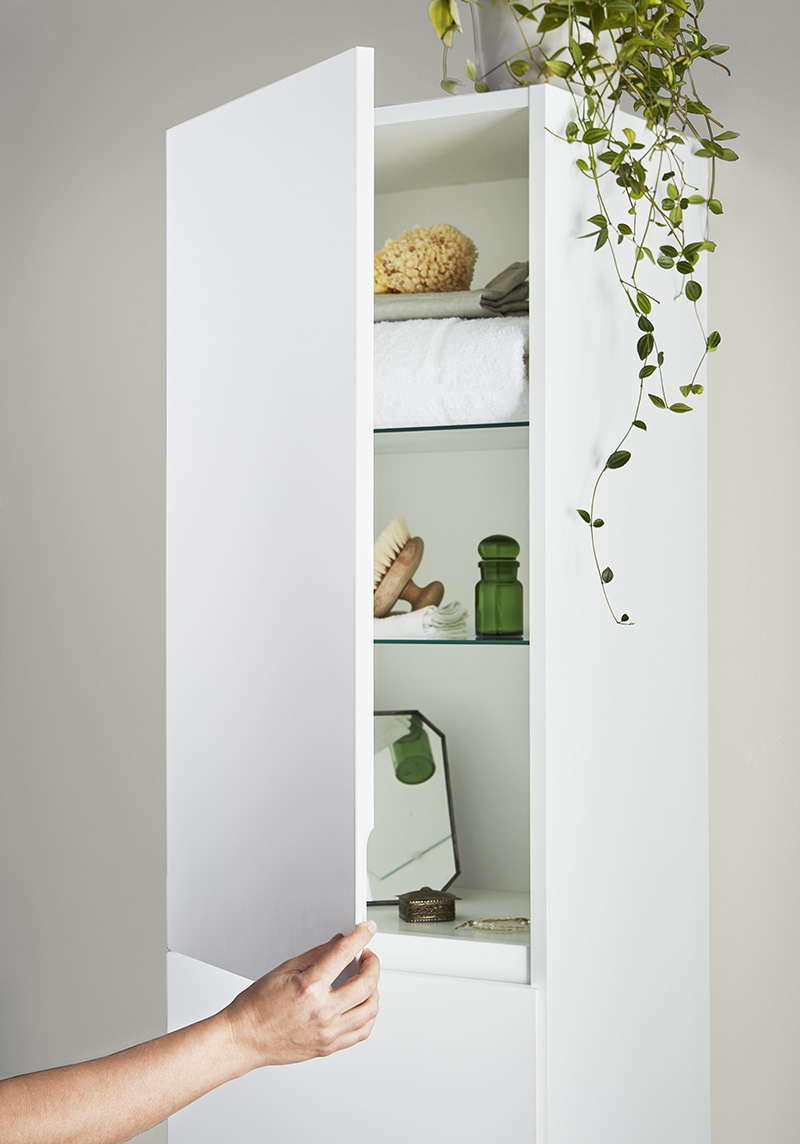 Kaksi pehmeästi sulkeutuvaa ovea, jotka voidaan asentaa oikealta tai vasemmalta avautuvaksi. Neljä korkeussuunnassa säädettävää lasihyllyä. Toimitetaan valmiiksi koottuna. Integroidut vetimet.