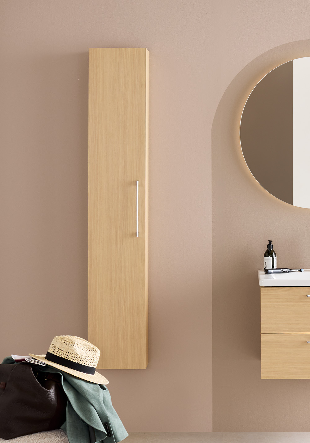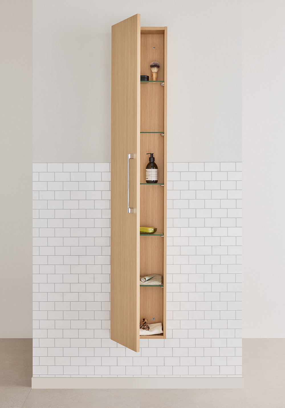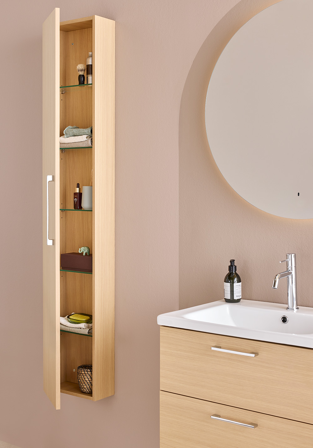 Noro Multi on tyylikäs ja toimiva kompakti korkeakaappi, joka luo järjestystä sekä tarjoaa lisää säilytystilaa kylpyhuoneeseen. Multi on varustettu viidellä siirrettävällä hyllyllä, jotka on valmistettu kirkkaasta lasista. Itsestään sulkeutuvat ja vaimentavat saranat sulkeutuvat pehmeästi ja hiljaisesti, mikä lisää laadun tuntua jokaisessa yksityiskohdassa. Kaapissa on kromattu vedin. Korkeakaappi toimitetaan koottuna, ja kaapin ovi voidaan asentaa oikealle tai vasemmalle. Osta mukaan pistorasia.