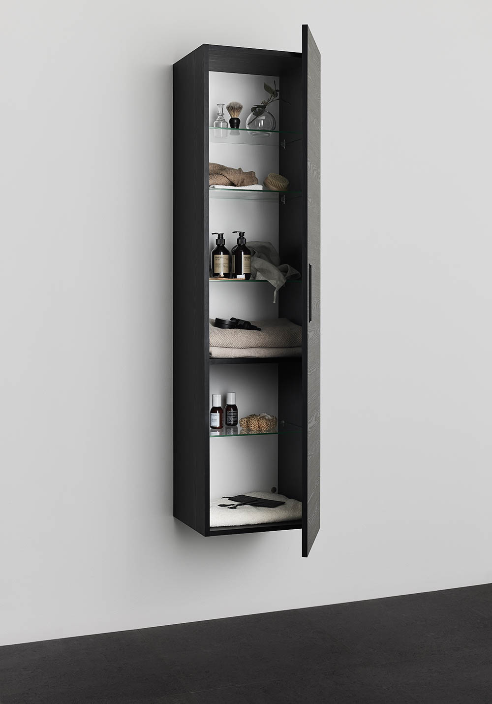 Noro Relounge korkeakaappi on tyylikkäästi muotoiltu ja luo personallisen ilmeen integroitujen vetimien ansiosta. Korkeakaappi tarjoaa runsaan säilytystilan. Saatavana mustalla puukuvioinnilla tai matta valkoisena. Kaapin sisäpuoli on aina valkoinen ja sisältää neljä siirrettävää ja yhden kiinteän hyllyn. Toimitetaan koottuna, ja valitset asennusvaiheessa oven kätisyyden. Osta lisäksi pistorasia.