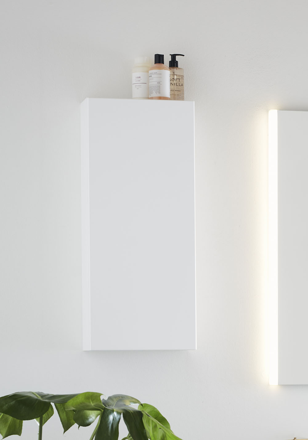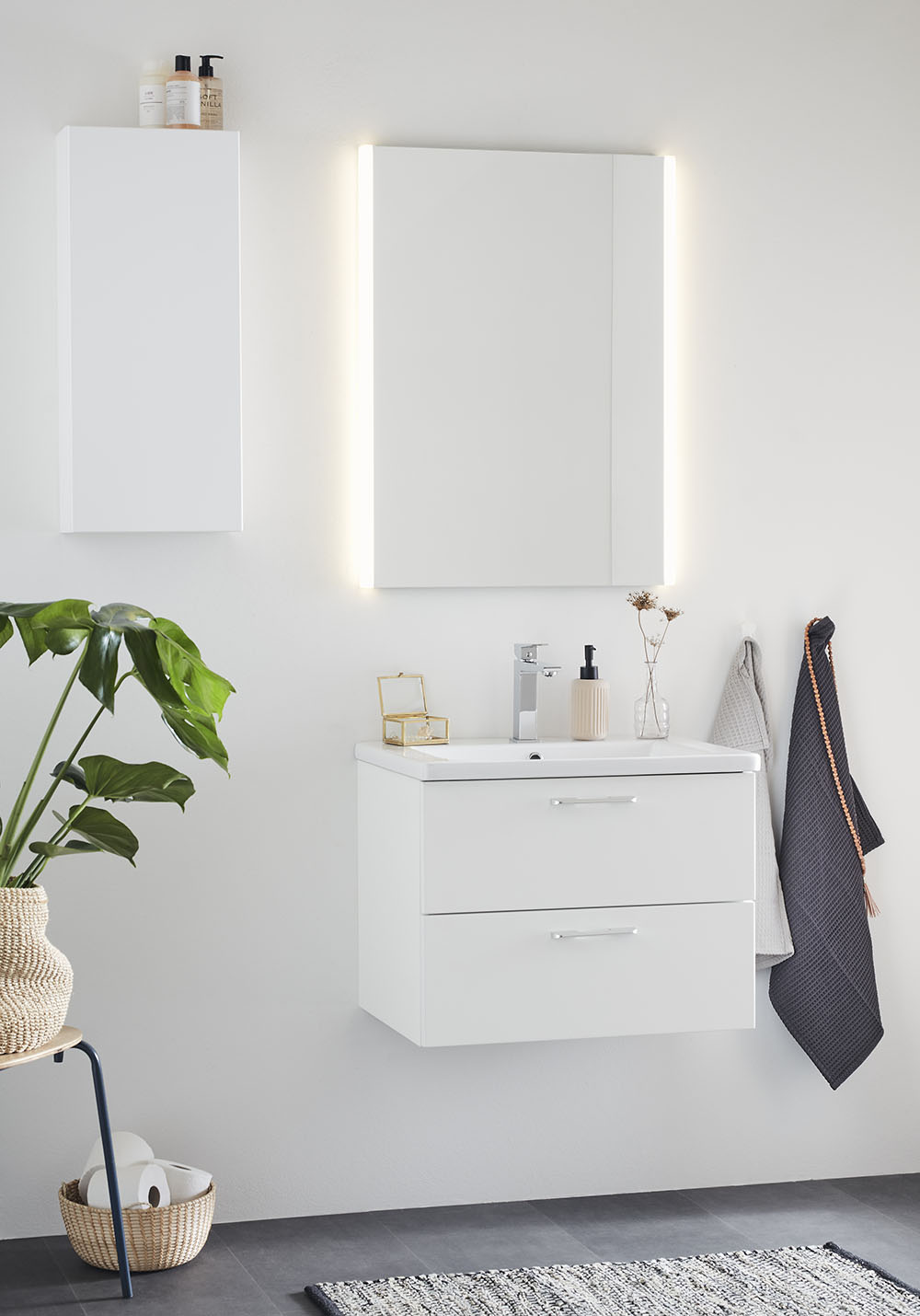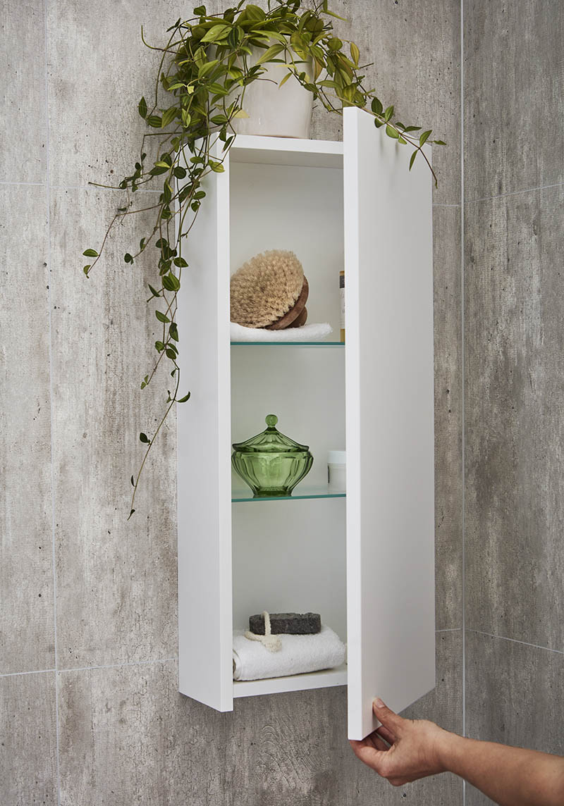 Pehmeästi sulkeutuvat ovet, jotka voidaan asentaa oikealle tai vasemmalle. Kaksi korkeussuunnassa säädettävää lasihyllyä. Toimitetaan valmiiksi koottuna. Vedin alla.
