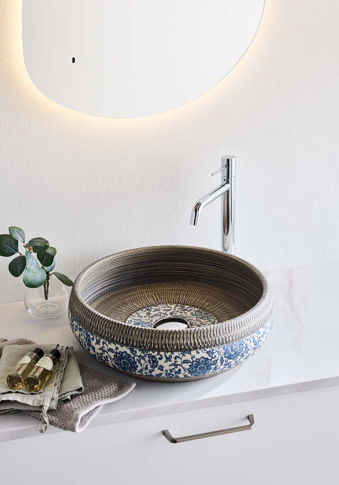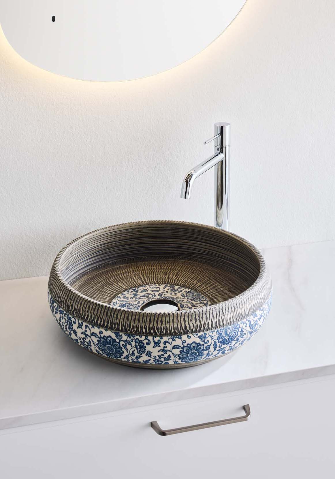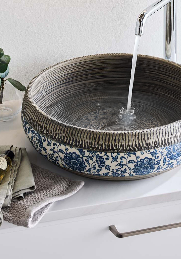 Noro Blossom malja-altaan kulhomainen muoto on koristeltu kauniilla sinisellä kukkakuviolla. Valmistettu mattapintaisesta posliinista. Jokainen allas on uniikki, eroja kuviossa ja/tai värisävyssä voi esiintyä. Osta lisäksi pohjaventtiili, joka sopii altaille ilman ylivuotosuojaa sekä korkea hana.