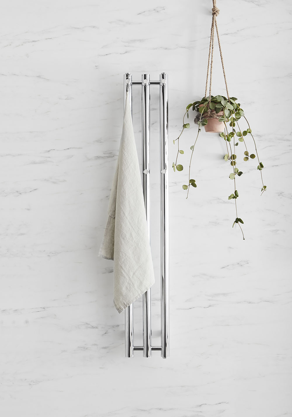 - Kätevä ja helposti sijoitettava pyyhekuivain, jossa pystysuuntaiset kromatut putket, jotka antavat parhaan mahdollisen kuivaustehon