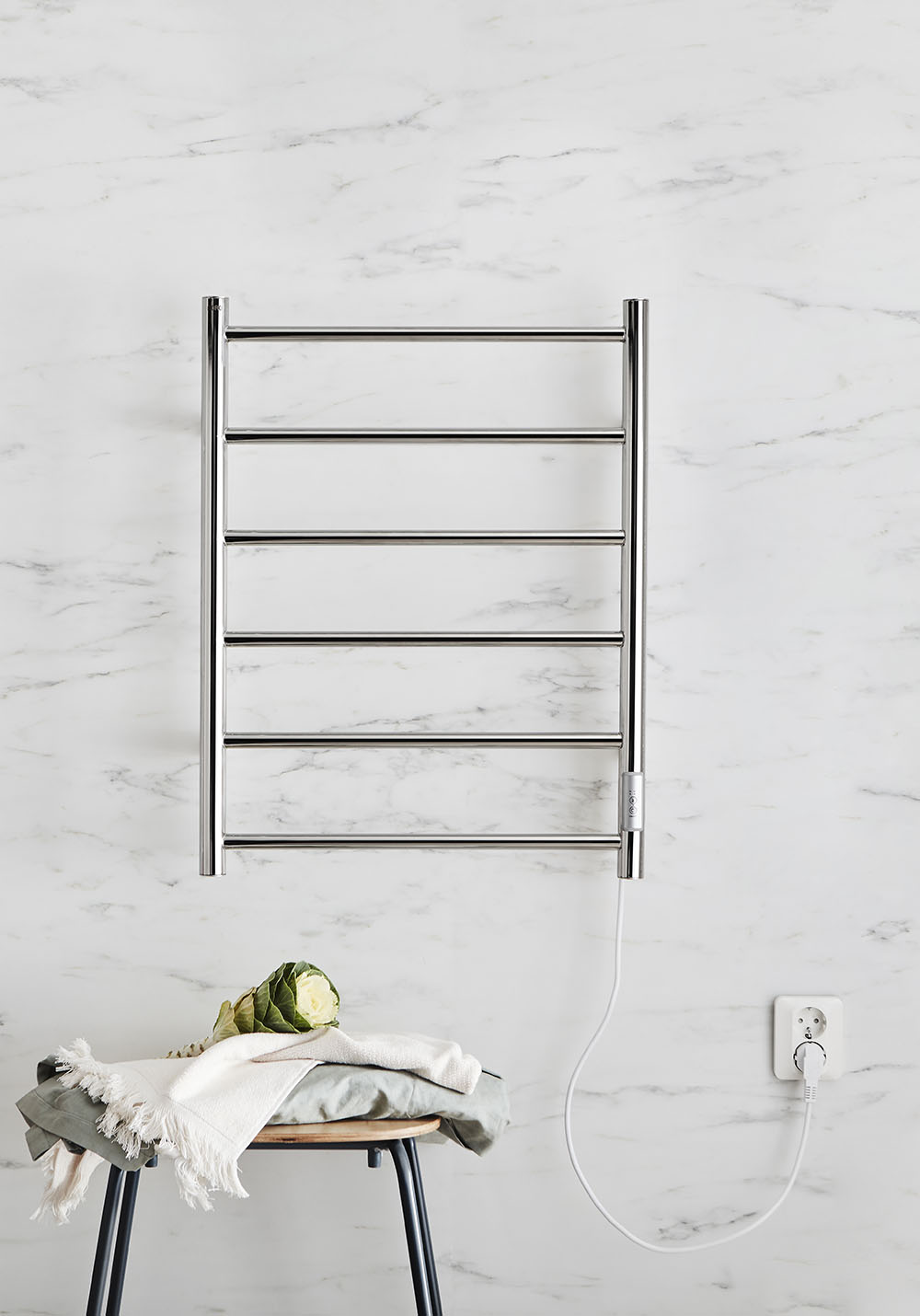 Pieni käytännöllinen pyyhekuivain joka sopii niin klassisesta moderniin kylpyhuoneeseen. IP44. Mukana pistoke johdolla sekä tarvittavat osat piiloitetulle liitännälle.